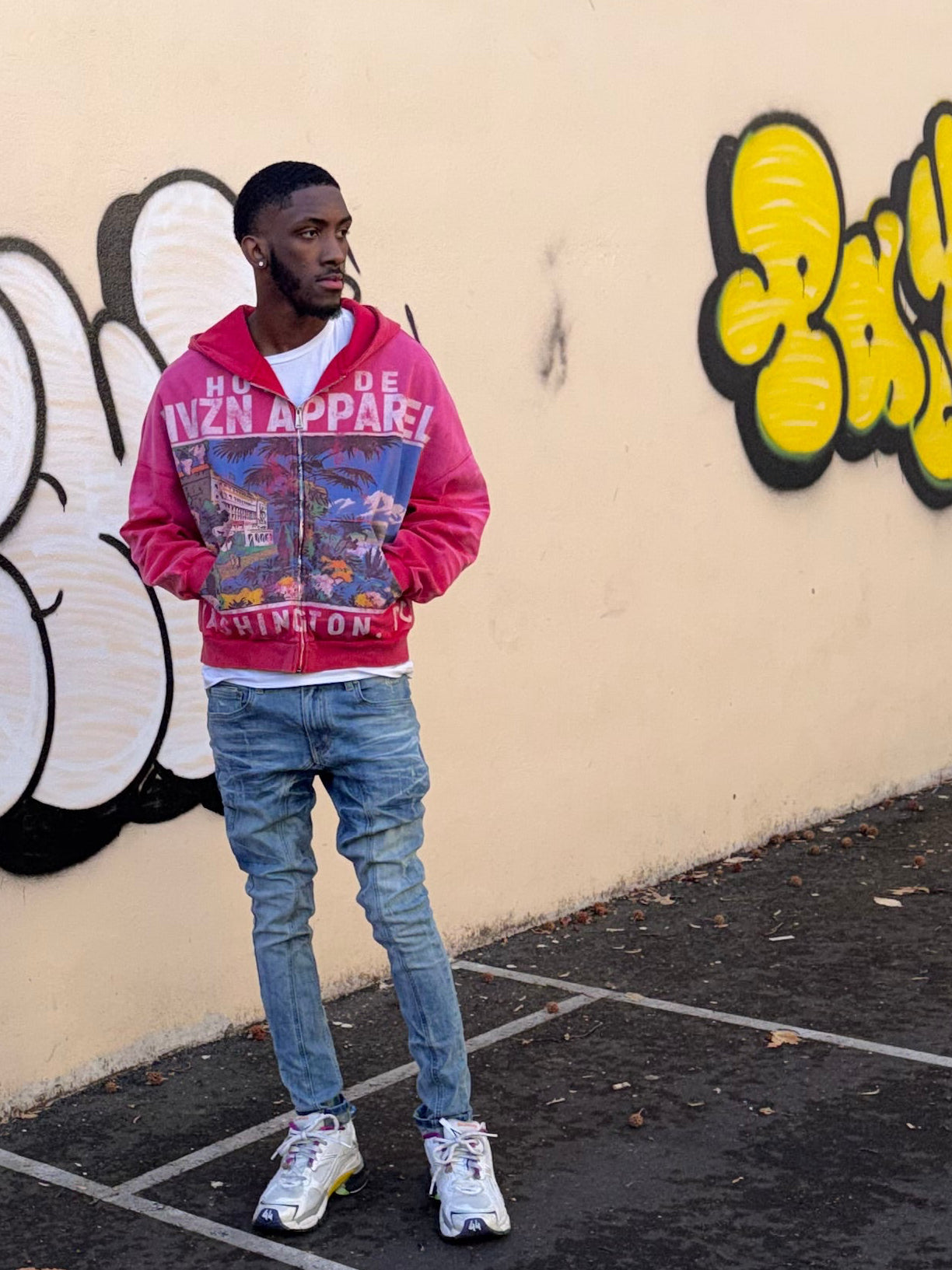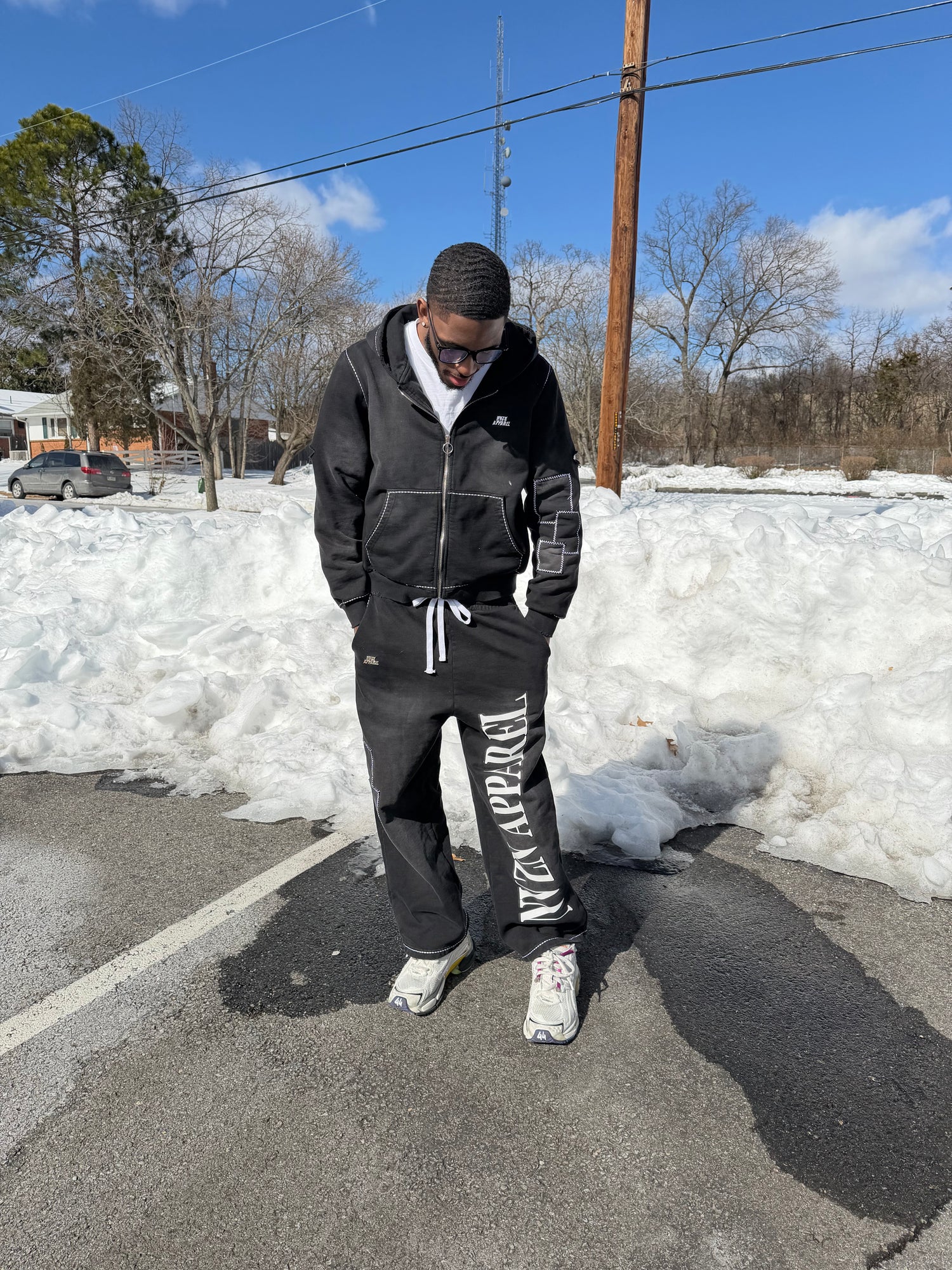 Distressed, Faded with metal modeled logos on the hoodie and the pants